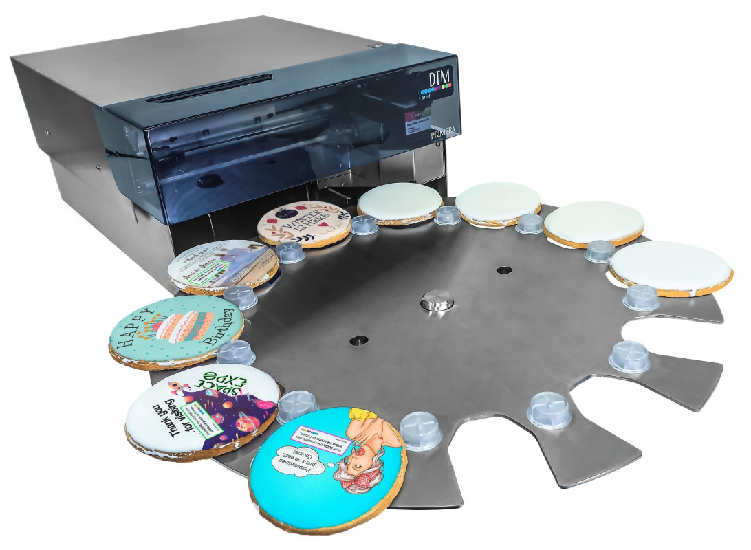 Der eigentliche Druckprozess ist schnell und einfach. Schnell, weil Eddie je nach Größe des Druckobjekts und Gestaltung des Druckmotivs bis zu sechs Objekte pro Minute bedrucken kann. Einfach, weil die zu bedruckenden Süß- und Backwaren automatisch und ohne manuellen Eingriff von der Karussell-Platte in die richtige Druckposition gedreht werden. Danach zieht der Drucker die Druckobjekte nacheinander ein, bedruckt und platziert diese wieder zurück auf die Karussell-Platte. So ist ein reibungsloser Arbeitsablauf möglich.