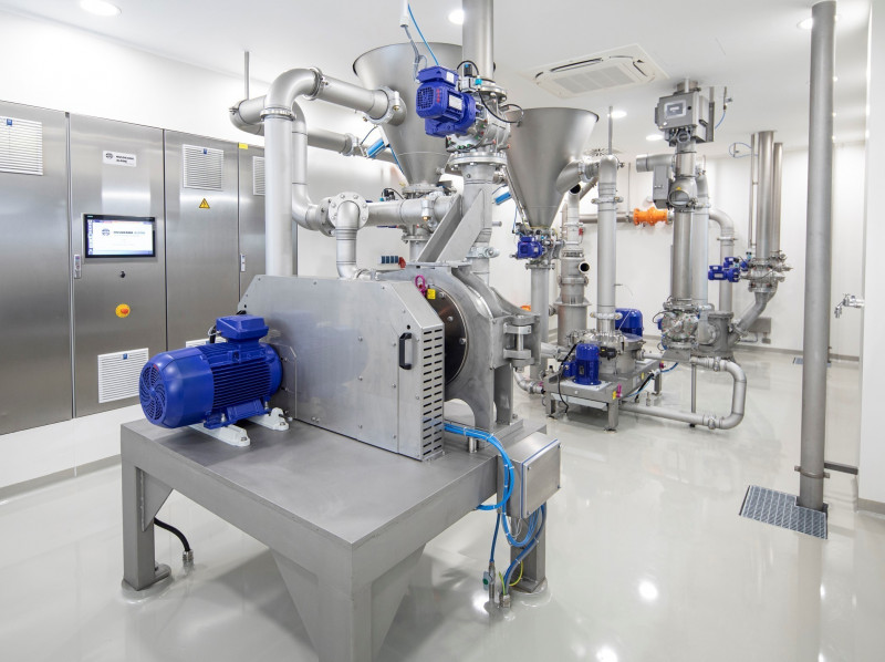 Der Mühlenraum ist klimatisiert und verfügt über eine lebensmitteltaugliche Bodenbeschichtung. Auf über 100 m² stehen drei Anlagen für die Kundenversuche bereit: Die druckstoßfeste Feinprallmühle Ultraplex UPZ 315 ist auf die verschiedenen Mahlgüter der Lebensmittelindustrie von kristallinem Zucker bis hin zu zähfaserigen Gewürzen anpassbar. Die Sichtermühle ACM 10 kombiniert Mahlen und dynamisches Sichten in einer kompakten Maschine und bietet unter anderem die Möglichkeit, während des Mahlvorgangs die Trenngrenze des Sichterrades stufenlos an das Mahlgut anzupassen. Der Feinstsichter ATP 200 vereint verschleißarme Arbeitsweise mit ultrafeinen Ergebnissen.