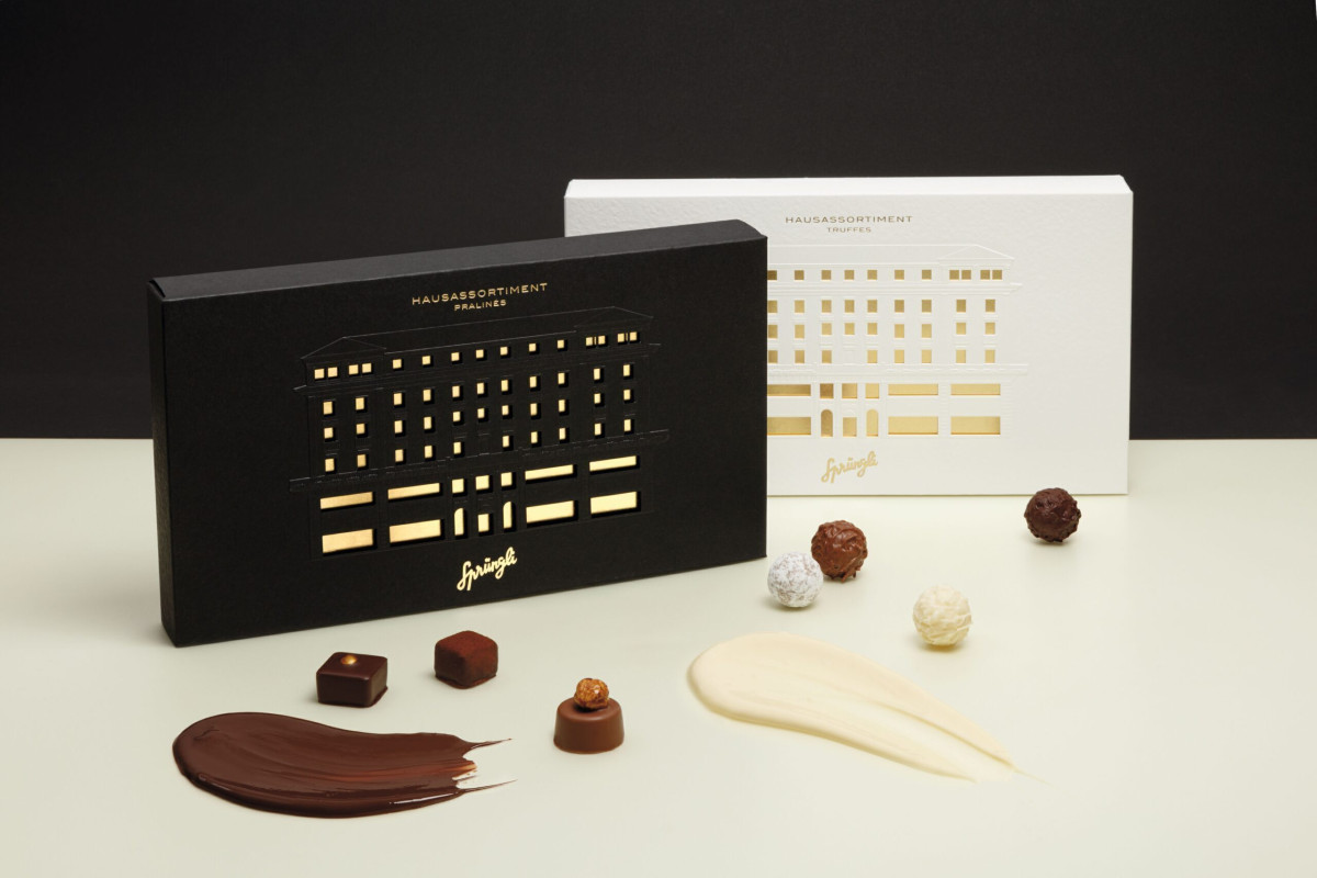 Herzstück ist das geprägte Relief des Zürcher Sprüngli-Hauptsitzes, erhältlich in Schwarz-Gold oder Weiss-Gold. Präzise gelaserte Fenster bieten einen ersten Blick ins Innere, während ein elegantes Stoffband das Auspackritual einleitet. Die Schublade mit goldveredeltem Deckel enthüllt die fein arrangierten Pralinen . Die Verpackung wird vollständig in der Schweiz produziert, unter Verwendung nachhaltiger Materialien und modernster Drucktechnologie.
