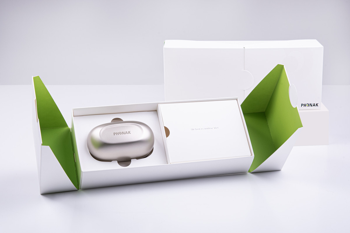 Nachhaltige Verpackungslösung für Phonak überzeugt internationale Jury Die ausgezeichnete Phonak-Verpackung steht exemplarisch für die nachhaltige Ausrichtung moderner Medical- und Pharma-Verpackungen. Sie besteht vollständig aus FSC®-zertifiziertem Frischfaserkarton, ist kunststofffrei und vollständig recyclingfähig. Gleichzeitig bietet sie zuverlässigen Produktschutz sowie hohe Effizienz in Transport und Logistik. Auch gestalterisch setzt die Verpackung Akzente: Ein klares, reduziertes Design sorgt für Orientierung und Wertigkeit, während das charakteristische Phonak-Grün im Inneren ein prägnantes Markenerlebnis schafft.