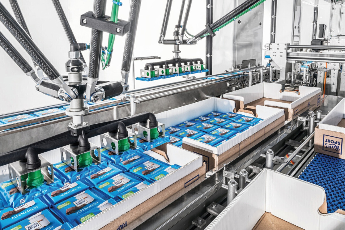 „Für uns bedeutet die kameragestützte Robotik vor allem eins: effiziente, da störungsarme Abläufe“, erläutert Wleklinski. Nur wenn Anzahl und Lage der Tafeln in den Transportschachteln stimmen, nehmen zwei Delta-Roboter pro Linie ihre Arbeit auf: In hoher Geschwindigkeit greifen sie jeweils fünf Tafeln gleichzeitig aus den einbahnig einlaufenden Kartonsteigen und legen sie auf ein Transportband mit den Flossen nach außen.