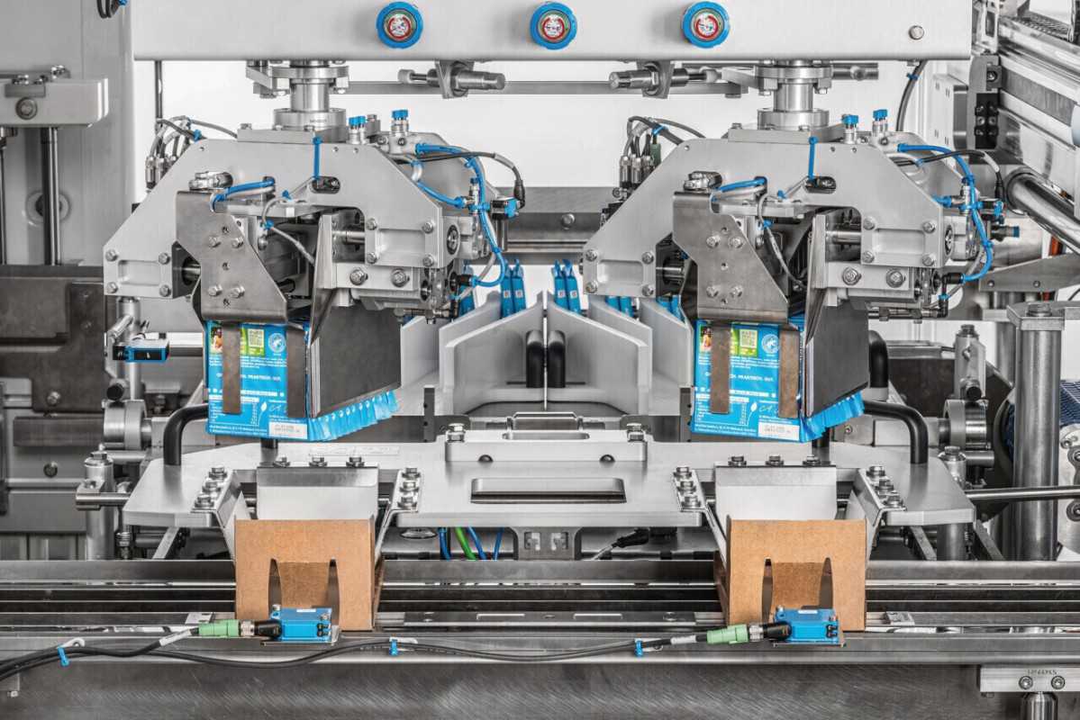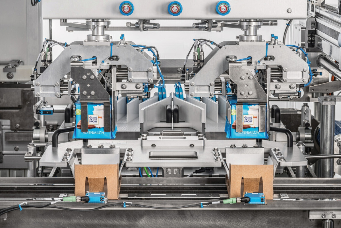 Über einen einbahnigen Zuführtransport geht es weiter zur Gruppierkette, die jeweils zwei Tafeln stehend zwischen zwei Mitnehmern führt. Das Besondere daran: Prozessbedingt stehen die Tafeln vorübergehend auf einer Flosse statt links und rechts der Verpackung befinden sich die beiden Siegelnähte oben und unten. Damit das nicht so bleibt, dreht eine Kippeinheit sie um 90 Grad. So stehen sie wieder mit den Flossen nach außen und mit der Schrift richtig orientiert, bevor ein TLM-F2 Füllroboter sie in aufgerichtete Schachtelunterteile setzt.