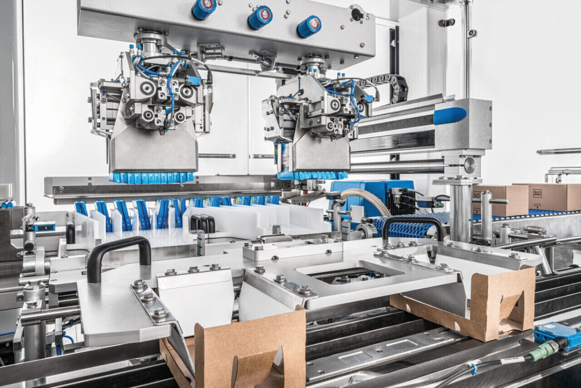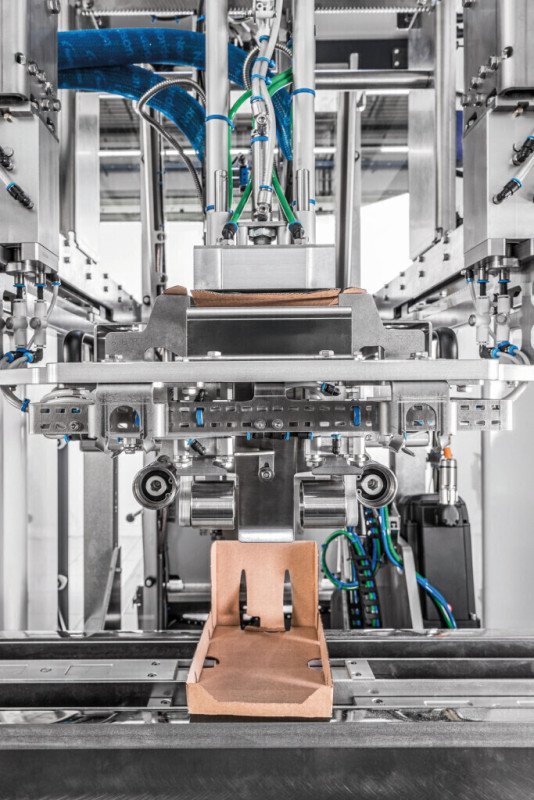 Wie bei Schubert üblich laufen die Faltprozesse parallel ab: Entstapeln, Beleimen, Aufrichten der Zuschnitte alles Vorgänge, die die beiden Linien fahren, während gleichzeitig Tafeln inspiziert, gepickt und gruppiert werden. Je nach Produkt schafft jede Linie zwischen 25 und 33 Displayschachteln pro Minute. So weit, so bekannt wäre da nicht eine weitere Anforderung, die sich im Laufe des Projektes ergab.