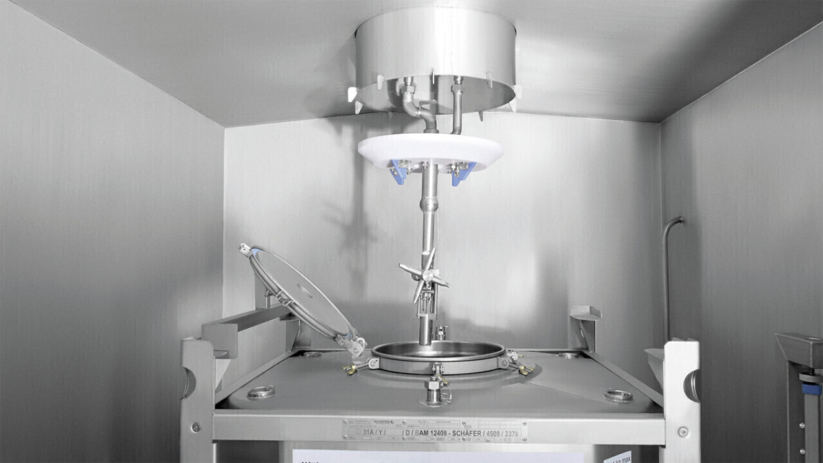 Die kompakte Kabinenwaschanlage aus Edelstahl 1.4301 ist auf die Innenreinigung von IBC-Containern spezialisiert und erreicht je nach Verschmutzungsgrad rund 5–6 Behälter pro Stunde. Eine Außenreinigung findet bewusst nicht statt: Der Fokus liegt auf der prozesssicheren Reinigung des Innenbehälters und der Ablassöffnung innerhalb einer Charge.