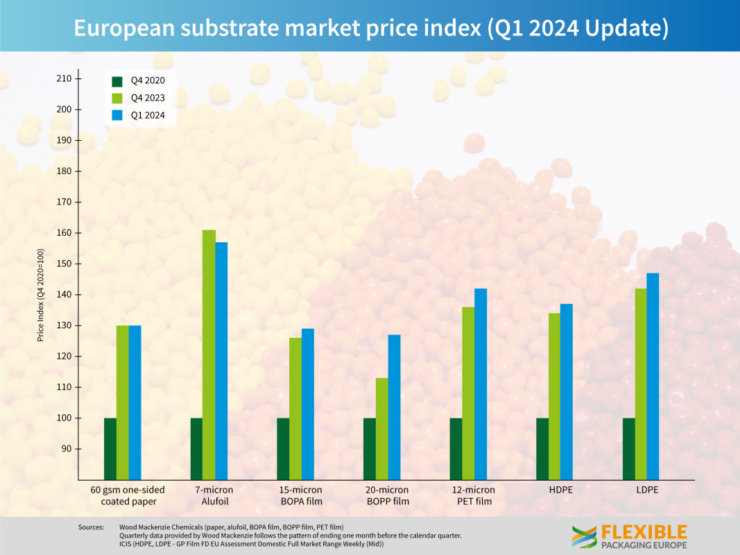 Prices across almost every flexible packaging material posted modest price rises in first quarter of 2024, compared with the end of 2023, due mainly to disruptions in the supply of resin and film caused by the shipping security issues in the Red Sea. Demand remains flat across all material markets. Both HDPE (up 2,3%) and LDPE (up 4,1%) continued the steady upward trend seen in the second half of 2023. 20-micron BOPP film surged 12% and now stands at a price last seen in Q2 of 2023. 15-micron BOPA film added a more cautious 2%, while 12-micron PET gained 4%, pushing it close to its early 2023 price. Only 60gsm one-sided coated paper held steady, with no change compared to the final three months of last year. Across the board prices are still well below the levels seen at the start of 2023, with both aluminium foil (down 16%) and 60gsm one-sided coated paper (down 24%) leading the way. However, in comparison with the benchmark of Q1 2020 prices remain between 27% (BOPP) and 57% (aluminium foil) higher. Santiago Castro from leading analysts Wood Mackenzie interpreted the latest figures, “Prices paid in Europe for flexible packaging materials mostly increased in Q1 2024. This was the case for BOPET, BOPA, and BOPP, which experienced the most significant increase. Prices paid for paper remained unchanged, but price increases are expected during Q2 due to increases in the cost of pulp. Aluminium foil saw additional price decreases due to conversion cost reductions. Although overall demand has improved for all substrates, mainly this has been due to restocking. End-user demand remains weak, but there are signs of improvement.” Guido Aufdemkamp, Executive Director of FPE commented on the latest figures, “If anything there is more uncertainty in the market than there was at the end of last year. Escalating tensions in the Middle East generally and the continued threat to shipping in the Red Sea have caused major disruption in the supply chain. The war in Ukraine also continues to have an impact both on supply and wider European demand of packaging materials and packaged goods. These issues are not likely to go away in the near future. But it seems the extreme destocking has come to an end in most segments and restocking to a more normal level has begun slowly. This factor, combined with a cautious upturn in demand, as prices and inflation stabilize, could mean the market for flexible packaging materials in Europe is set for modest growth later this year.”